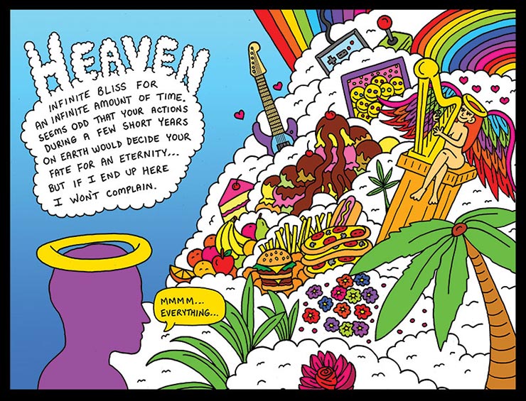 It’s a brilliantly-done look at the various after-death scenarios posed by world religions, science and philosophy. The comic covers the many possible futures that await a human being upon shuffling off this mortal coil. Never has existential dread looked so colorful!