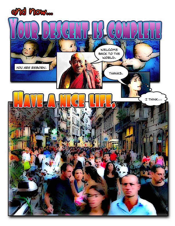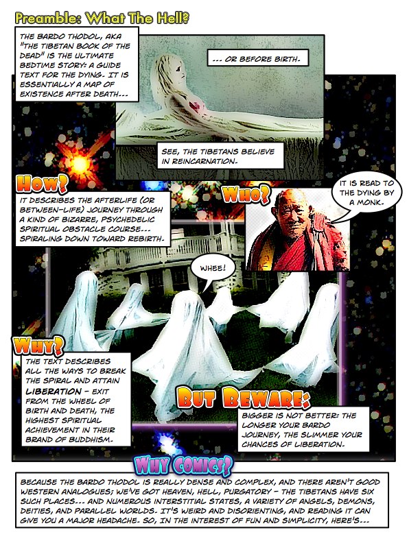 The comic book below, created by Thomas Scoville, used to be all over the Internet. Unfortunately, it’s now vanished from all but a few backup archives. The graphics are pretty basic. However, the comic brilliantly sums up exactly what the bardo is, and how to transit it. I’ve saved it here for posterity—enjoy!
